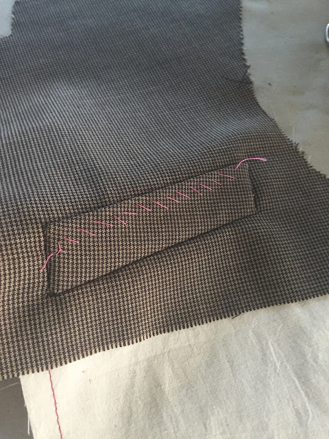 Meanwhile, in my Ladies Tailoring class, we're working on jacket pocket samples. Below is a sample breast pocket with a single slightly diagonal welt. Notice that the pattern on the welt is somewhat off -- the stripes should be perfectly parallel with the vertical and horizontal stripes on the body of the jacket. This is why it's a good idea to make samples first. It's also why it's a good idea to avoid checks and stripes -- but you know me: I love a challenge!