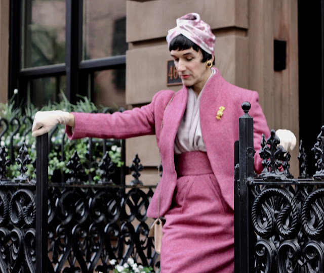 ReplyDeleteBeautiful tailoring work, Peter. The raspberry color tweed is perfect for this very classic looking suit, and the accessories added to the "vintage" look!