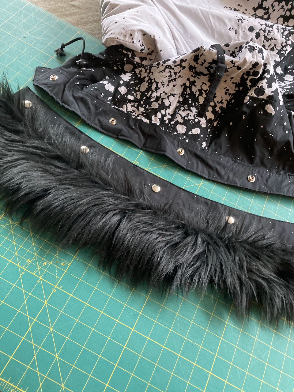 I am glad I went the whole way with this hood because the result really looks cool and the fur trim is easily removable. But it took me a couple of days to complete. Needless to say, all the individual pieces had to be underlined and reinforced in the snap areas to make sure the snaps held securely. Five button loops (made out of elasticized cording) and five buttons hold the fur piece to the inside of the hood. You can also let the fur flip out more, if you like that look, by simply skipping the buttoning on the inside of the hood.